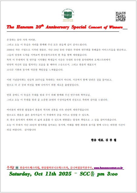 오늘 이 무대가 지난 20년의 발자취를 돌아보는 동시에, 미래를 향한 희망과 용기를 함께 나누는 따뜻한 시간이 되길 바랍니다.