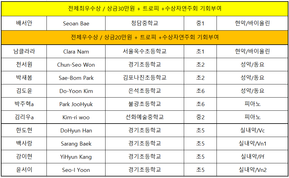 제56회 한음음악콩쿨에서는 1 부문에서 1명의 전체최우수상 & 4부문에서 7명의 전체우수상 자가 나왔습니다
