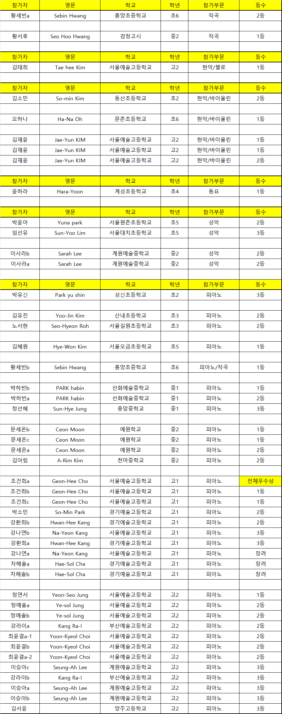 모든 수상자들에게 축하를 전하며, 그중에서도 피아노부문의 최고 전체우수상이  발탁되었습니다