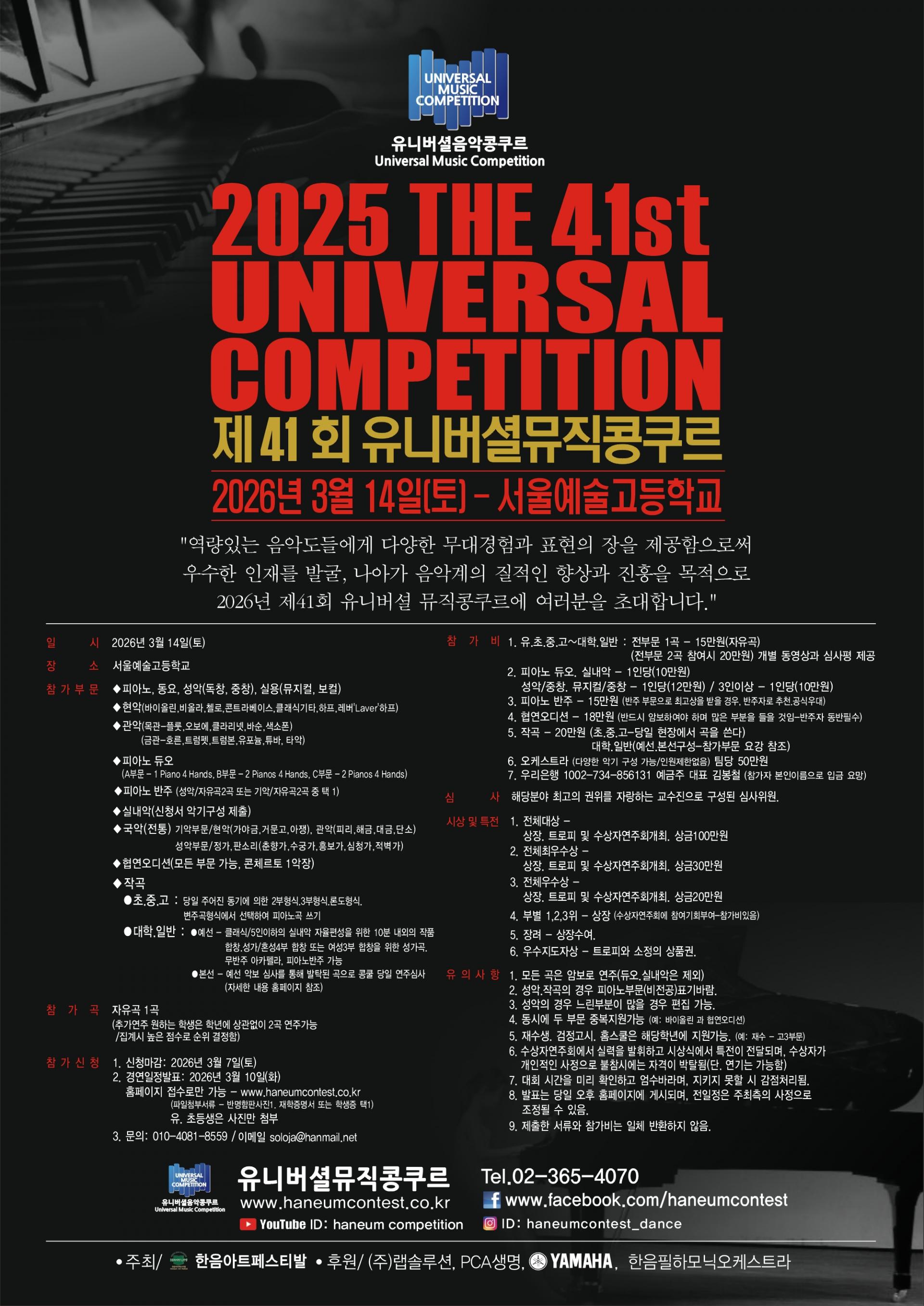 ♥ 41st The Universal Music Competition ♥"역사와 전통을 자랑하는 예술계의 등용문인 한음에서 음악도 여러분들을 초대합니다."(원하는 참가자는 자유곡 2곡~4곡 연주 가능함)심사위원님들의 개별 총평 + 연주동영상 제공▶자유곡 두곡 20만원+추가 한곡당 5만원◆ 일시 : 2026년 3월 14일 (토)◆ 장소 : 서울예술고등학교◆ 모집 마감 : 2026년 3월 7일(토)◆ 시간 발표 : 2026년 3월 10일(화)◆ 참가신청 : www.haneumcontest.co.kr (구)www.uvmusiccontest.com